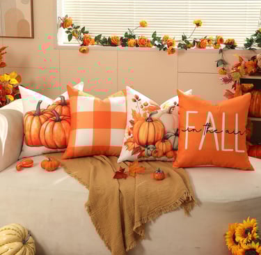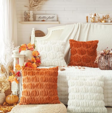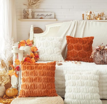 Swapping pillow covers is one of the easiest (and most affordable) ways to update your home for fall. Shades like terracotta, caramel, mustard, and deep burgundy instantly warm up a space. Don’t forget texture — velvet, linen, and embroidered fabrics add depth and richness. Mixing different sizes creates a layered, inviting look that’s perfect for cozy nights in.
