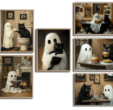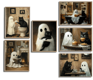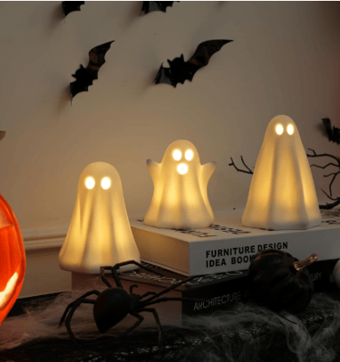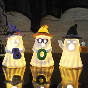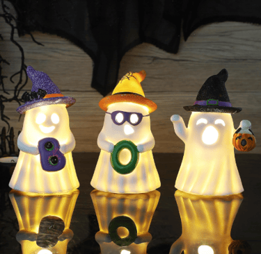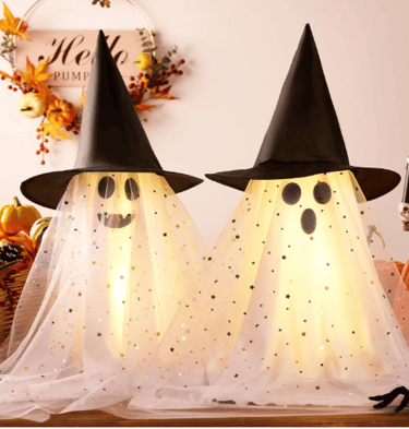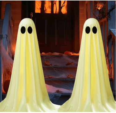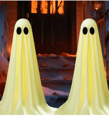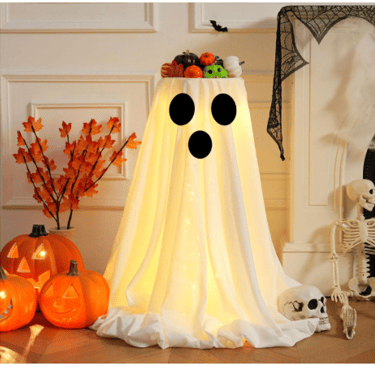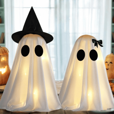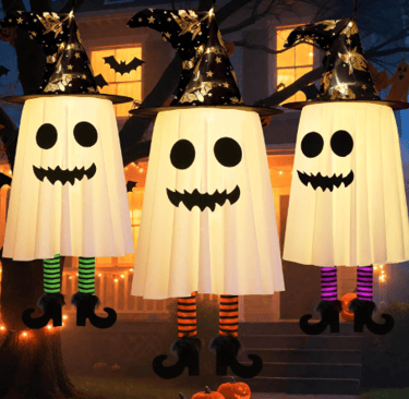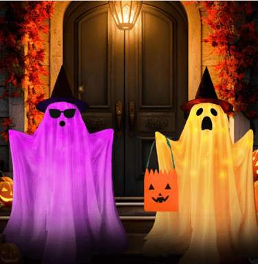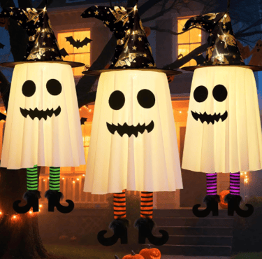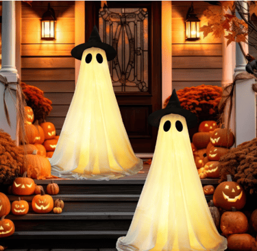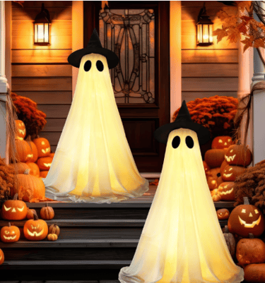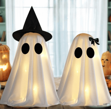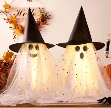 Take simple ghost decorations and personalize them with hats, colorful scarves, stylish glasses, or funny ties. I love hanging them on the porch or entryway—the contrast between the spooky ghost and the unexpected accessory is so fun! Printed fabrics or neon accents add a special touch. This idea proves how small details can make a big impact. These are the ghosts I chose to bring your idea to life. Check them out.