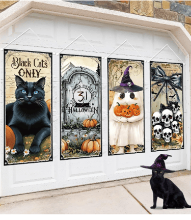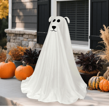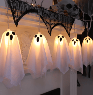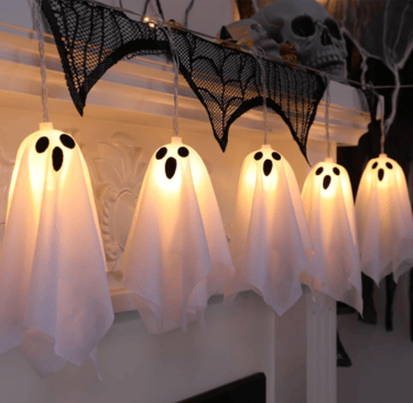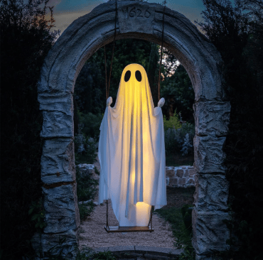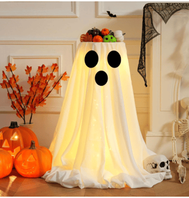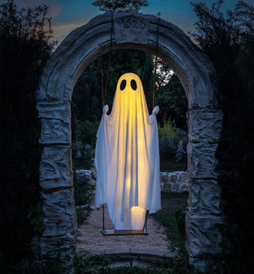 Spooky, yes — but make it funny! Create simple ghosts using lightweight sheets, white fabric, or tulle, and hang them so they sway with the wind or shadows. Add funny faces or expressions with fabric or black paint to make each one unique. I love hanging them by the window, on the porch, or from the trees — the effect is almost magical. Even fixed pieces look amazing with soft lighting. You can also find ready-made decorations to save time. See fun ghost ideas below View on Amazon.