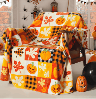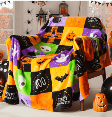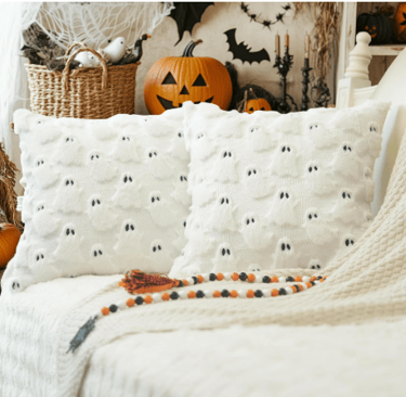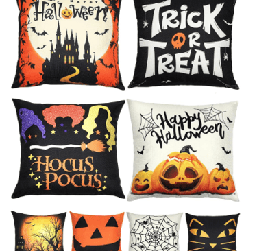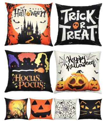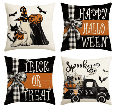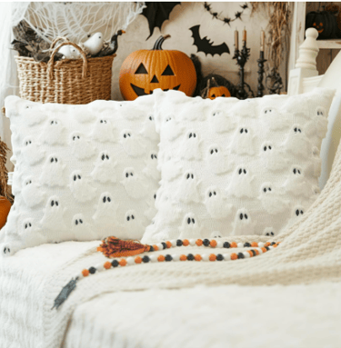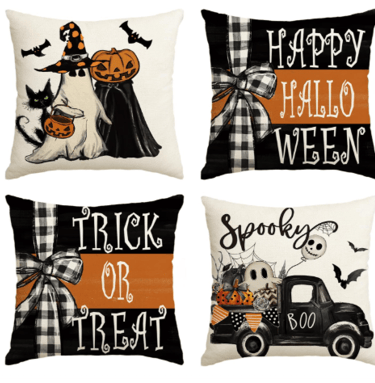 Swap your usual throws, pillows, or tablecloths for ones with fun Halloween prints — cats with hats, smiling pumpkins, or dancing bats. I toss themed throws on the couch, drape them over chairs, and even switch pillow covers. Colors like purple, orange, or lime green pair beautifully with neutrals. It’s an affordable and effortless way to refresh your space. Check out themed fabrics and funny Halloween pillows.