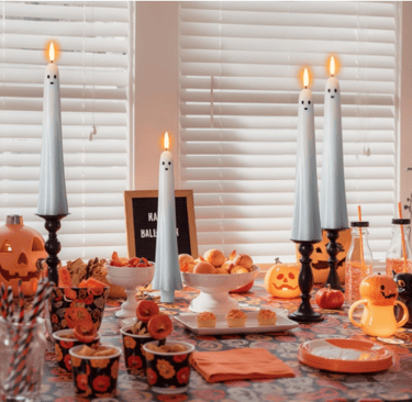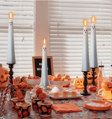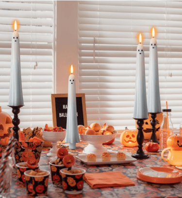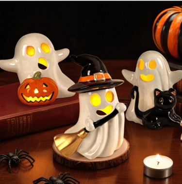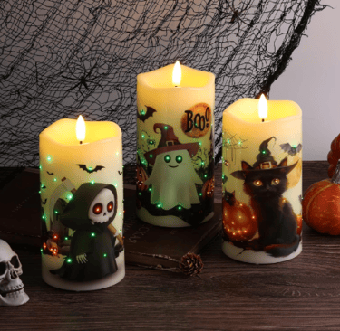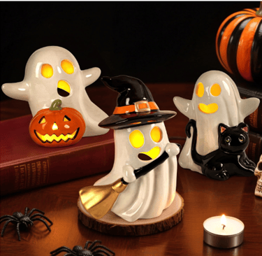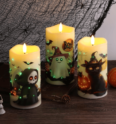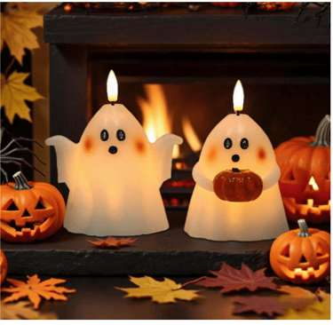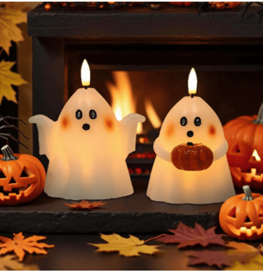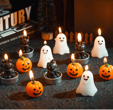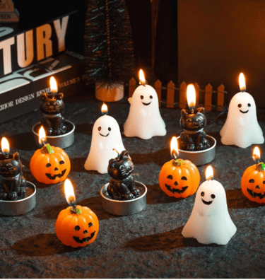 Candles shaped like smiling skulls, tiny witches, or happy spiders add a whimsical touch. I place them on the console, coffee table, or even near the fireplace — they light up the room and spark smiles. Choose fall scents like cinnamon or pumpkin spice for that cozy vibe. I always use LED or protected candles for safety. Browse funny decorative candles.